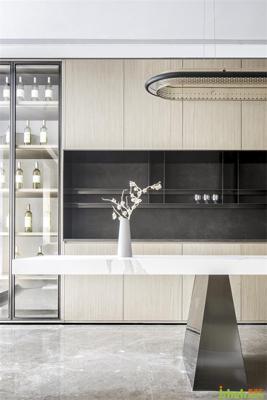 疊墅樣板房設(shè)計師在別墅一層的設(shè)計中,打破了傳統(tǒng)的客餐廳的布局,讓開放式廚房成為了視覺的中心和所以動線的連結(jié)。6200mm的一體化超長餐桌島臺,強調(diào)簡約美學(xué)與功能的平衡,提升烹飪的效率及美感,它當(dāng)然可以輕松滿足家庭的餐廚需求。而通過島臺這個寬敞的社交與自由流通的空間,將其變?yōu)橐粋€吸引所有家人成員活動的磁石,才是本案設(shè)計的真正主旨。