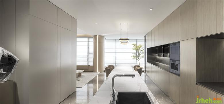 烹飪是一種快樂,在追求廚房社交屬性的當(dāng)代,設(shè)計師將客餐廳不同部分的聯(lián)系建立在流線帶來的自由度上,并讓區(qū)域之間有著互通邏輯的流線。