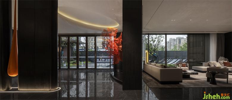 售樓處入口的接待大堂,是一個擁有沉靜安寧氣場的空間,而在這個深色調(diào)的空間中,一塊完整的山水紋大理石如同山水長卷般在空間中心徐徐展開,它和極簡的金屬線條構(gòu)成了接待臺的全部體量,這是一筆點睛的留白之筆,售樓處設(shè)計在燈光氛圍的烘托和聚焦之下,人流會像魚群一樣很自然地被吸引過去,如同走向故宮珍寶閣中展開的供人觀賞的千年畫卷。