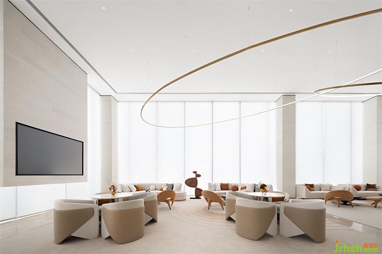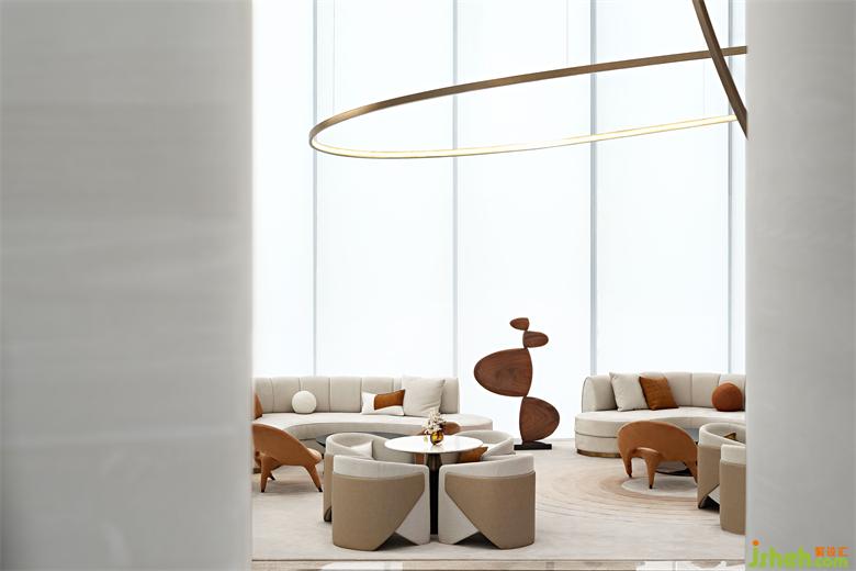 整個(gè)空間摒棄掉傳統(tǒng)的大型隆重的裝飾吊燈,用裝置藝術(shù)的手法去考慮室內(nèi)燈飾的布陳,大量簡(jiǎn)潔干練的弧形環(huán)形的藝術(shù)燈飾穿插其中,猶若星辰運(yùn)行的軌跡。