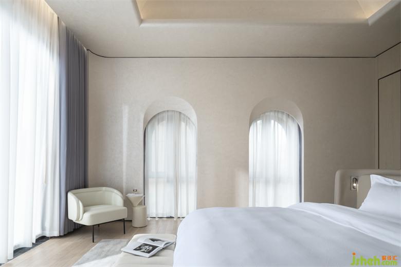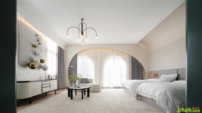 親子主題的客房空間也同樣通過立面的重塑規(guī)避了建筑開窗問題的痛點(diǎn),米色和灰色的日系配色,加上弧形鏤空的可愛立面造型,民宿設(shè)計(jì)讓整個空間充滿了童真和夢幻感。