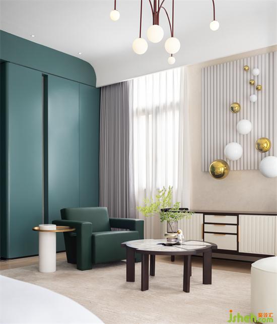 而這個隔斷除了裝飾性外,也魔術(shù)般地隱藏了一個大體量的迷你吧于書架旁側(cè),民宿設(shè)計(jì)將空間功能與實(shí)用性最大化。