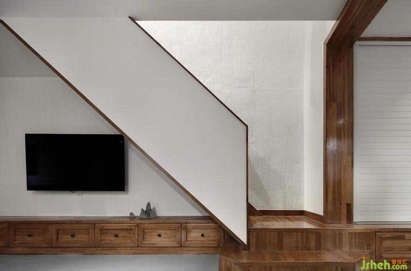 鞋帽柜以及電視柜的布置結(jié)合樓梯的第二踏,形成換鞋座面,讓老人和兒童變得輕松,下方整排抽屜放置零碎物品,避免了空間凌亂,整體自然和諧。