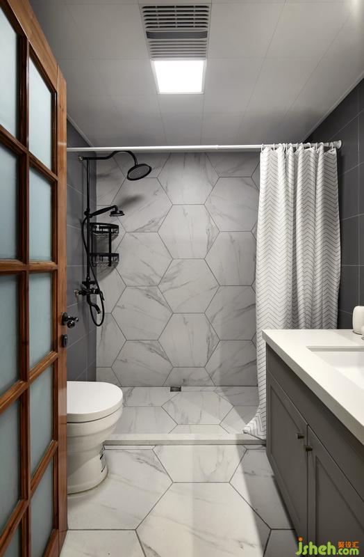 衛(wèi)生間呼應(yīng)整體,沒有多余色彩,灰色白色的墻地磚干凈利落,采用大六角磚的墻地鋪貼多了些個性。