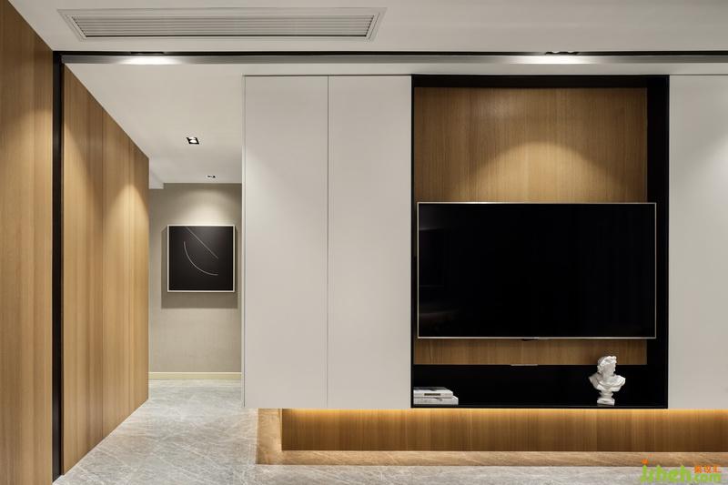 室內(nèi)設(shè)計(jì)師放棄傳統(tǒng)的電視柜,木色、白色比例合理,空間簡(jiǎn)約干練。