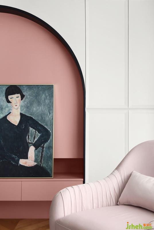 餐廳以黑白灰為主要色調(diào),然后用粉色的餐椅和黃色的裝飾畫來柔化空間的質(zhì)感,增添餐廳空間的活潑度。餐邊柜同時(shí)也兼具個(gè)性和美感,還呼應(yīng)了電視柜的弧形元素。