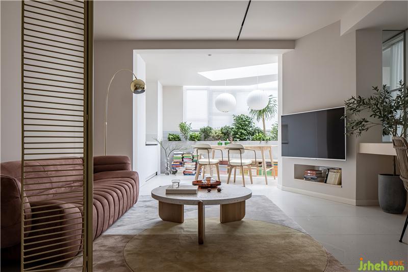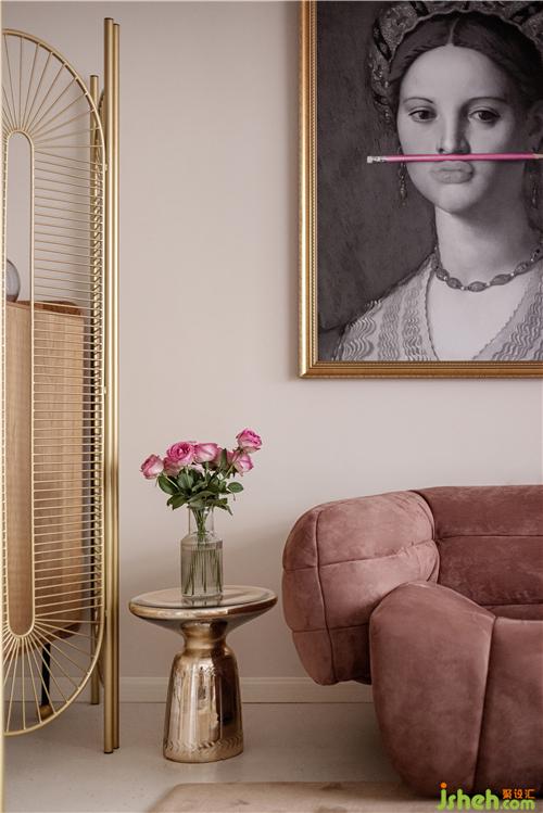 墻頂面使用非常淺的咖色包裹,使用同色系棕色沙發(fā)壓住畫面,地面采用同色系啞光地磚鋪設(shè),搭配黃銅屏風(fēng)與金色落地?zé)簦臻g使用復(fù)古元素連續(xù)穿插,整體使用大地色系制造溫柔。室內(nèi)設(shè)計(jì)師