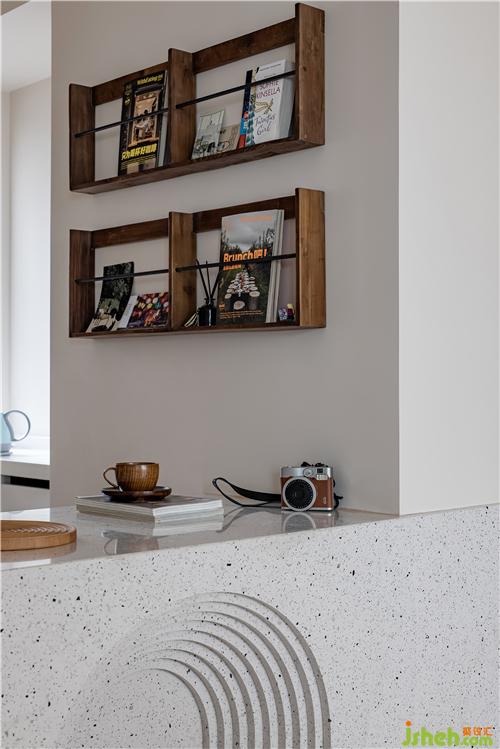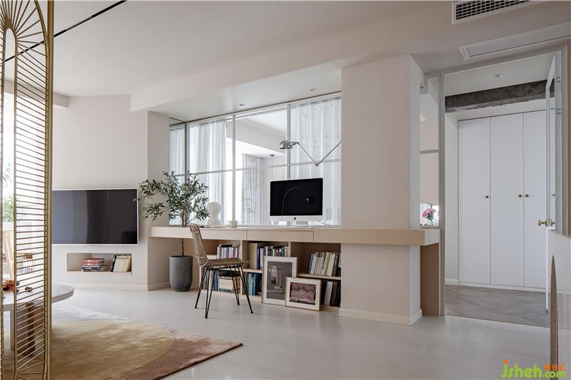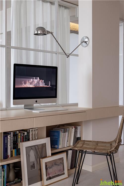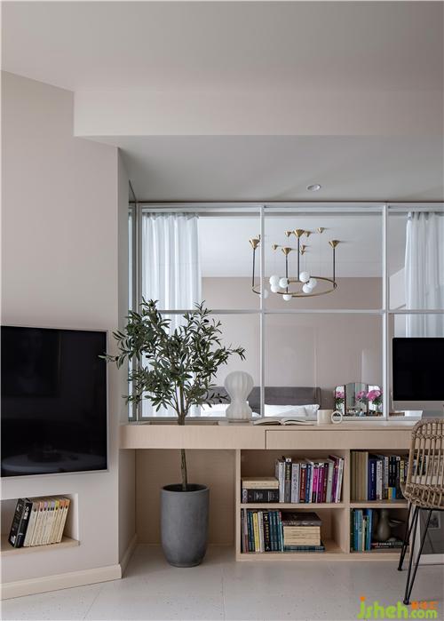 在客廳現(xiàn)場制作可供兩人使用的辦公寫字臺(tái),下方用書柜支撐,寫字臺(tái)也起到劃分客廳與臥室的功能,弱化電視背景,整體為業(yè)主量身打造。寫字臺(tái)下方書柜放置常用備課書籍,客廳與臥室之間僅用通透玻璃紗簾分隔。室內(nèi)設(shè)計(jì)師