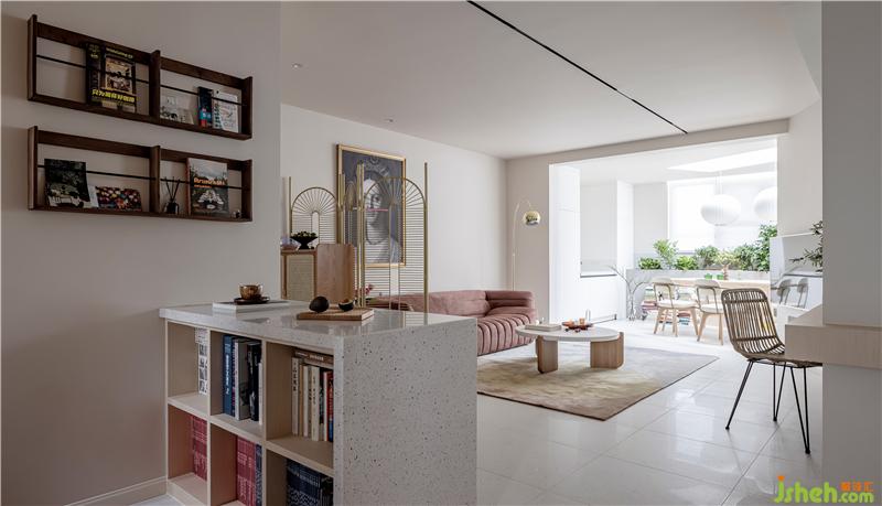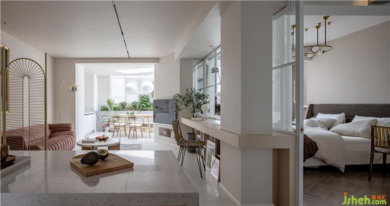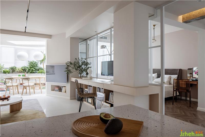 吧臺區(qū)看向客廳寫字臺和主臥。