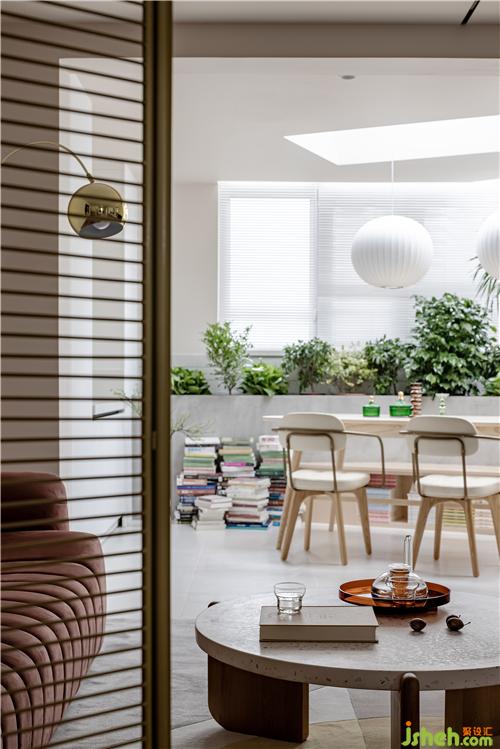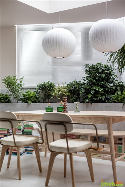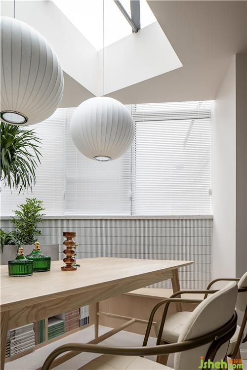 餐廳將戶外陽臺封閉,開設(shè)天窗,增加植物景觀,下設(shè)木制卡座,集合書柜,搭配原木色餐桌與皮制餐椅進行混搭,整體色系將客廳空間與餐廳空間氛圍融合過渡。 餐廳卡座同樣選用原木色搭配,一反復古常態(tài)。