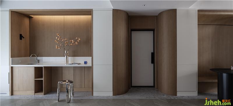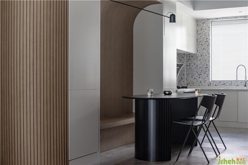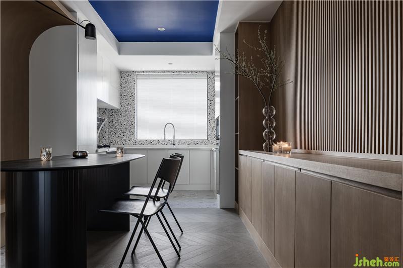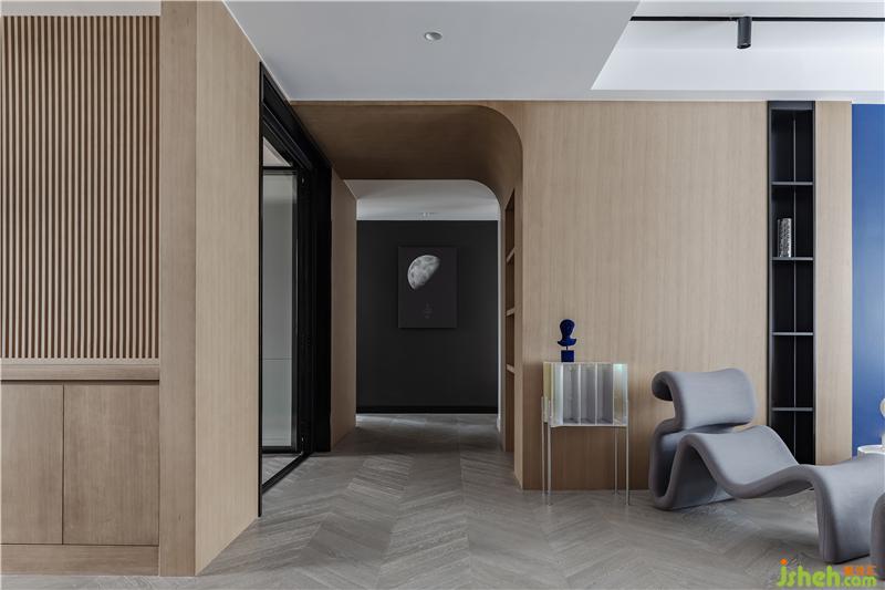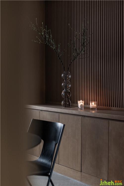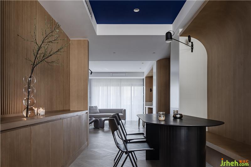 過道吊頂連貫餐廳及客廳的木飾面弱化過道,黑色墻面的運(yùn)用給能平靜的感受。室內(nèi)設(shè)計(jì)師