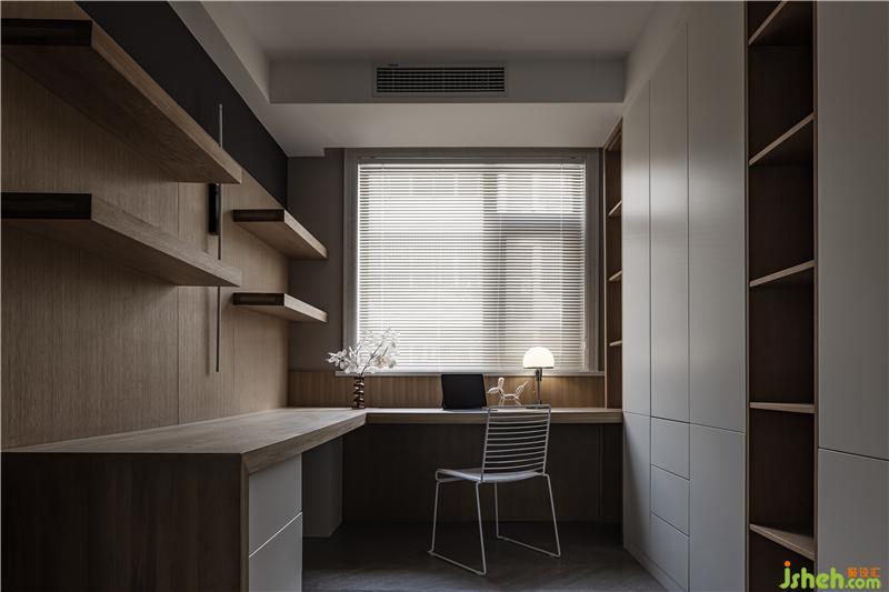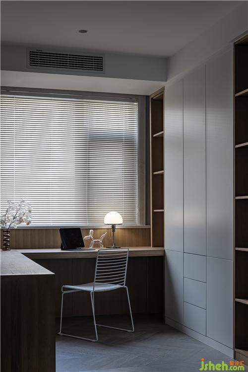 書房開放化設(shè)計(jì),超長L型寫字臺(tái)可輕松容納兩人同時(shí)學(xué)習(xí)辦公,大量的儲(chǔ)物柜可放置各種書籍及物品。