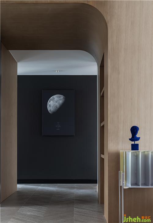 過道處利用原有次臥門洞制作展示功能隔板,暗藏LED燈帶起到照明功能。