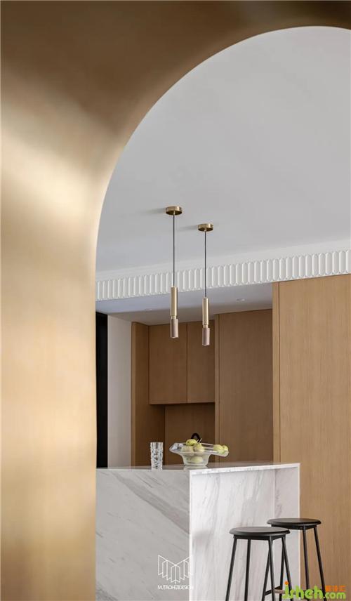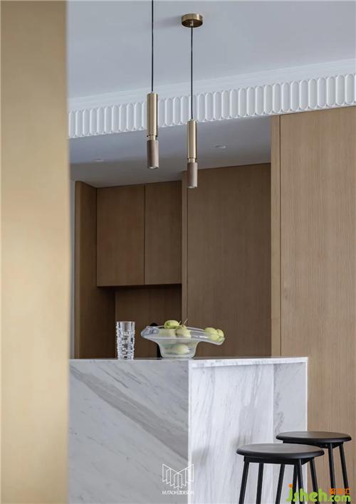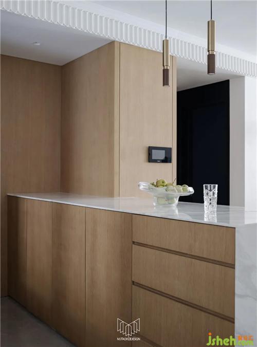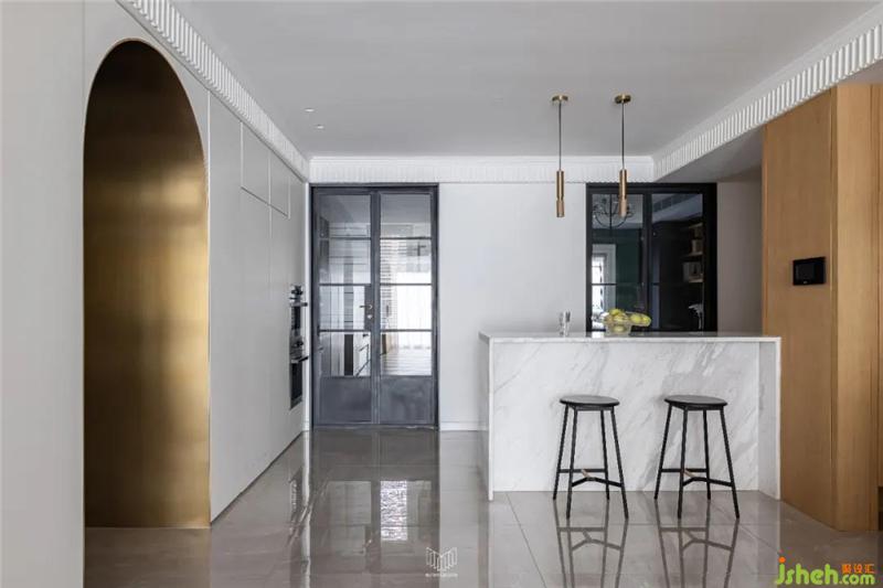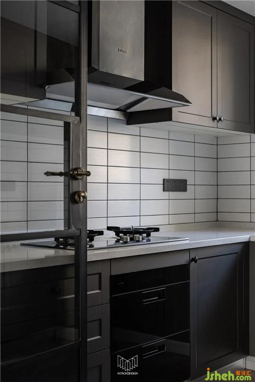 原餐廳位置設(shè)計(jì)西廚水吧臺(tái),滿(mǎn)足日常泡茶品酒需求,客廳儲(chǔ)藏柜柜體延伸至此區(qū)域,南京室內(nèi)設(shè)計(jì)師內(nèi)嵌冰箱及蒸烤箱等電器。廚房和書(shū)房定制對(duì)開(kāi)復(fù)古老鐵門(mén),彰顯復(fù)古元素,配合整體氛圍。