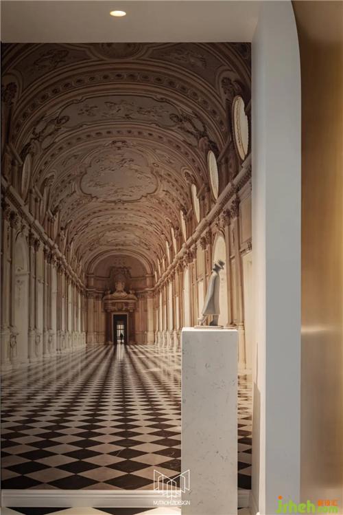 銅色圓拱門(mén)洞加上墻面立體壁畫(huà)、黑白棋盤(pán)格地磚、定制款歐式石膏線(xiàn)條都在渲染整個(gè)空間的品味和格調(diào)。