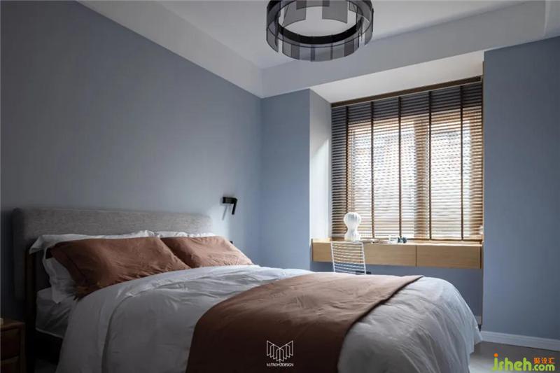次臥室是業(yè)主的父母房,所以設(shè)計較為穩(wěn)重。窗外的自然光透過木制百葉窗,為空間帶來靜謐和儀式感。
