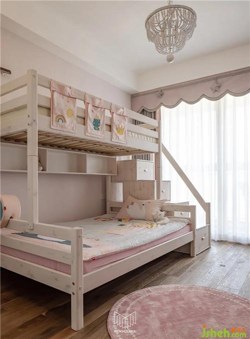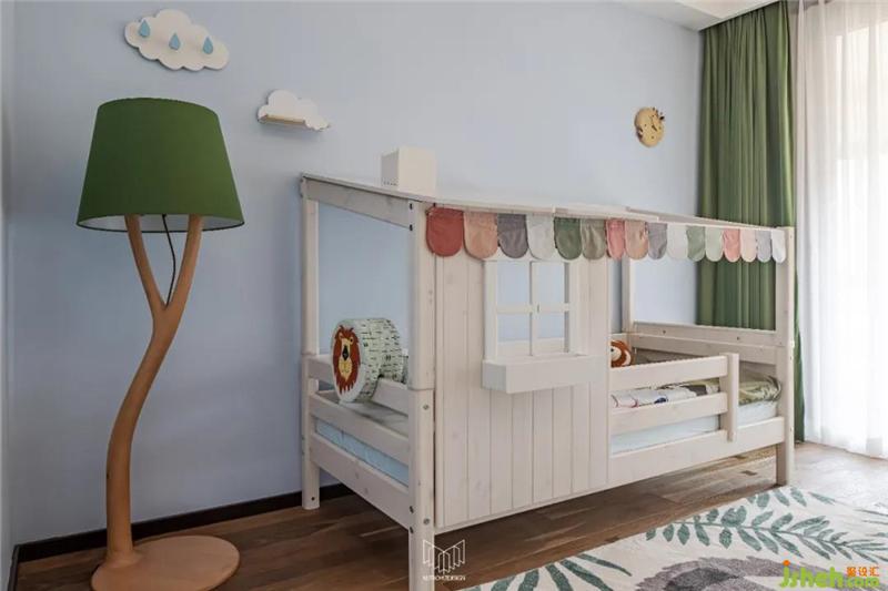 兩個(gè)寶寶房間分別被布置成藍(lán)色天空下的小叢林和粉甜的公主屋。