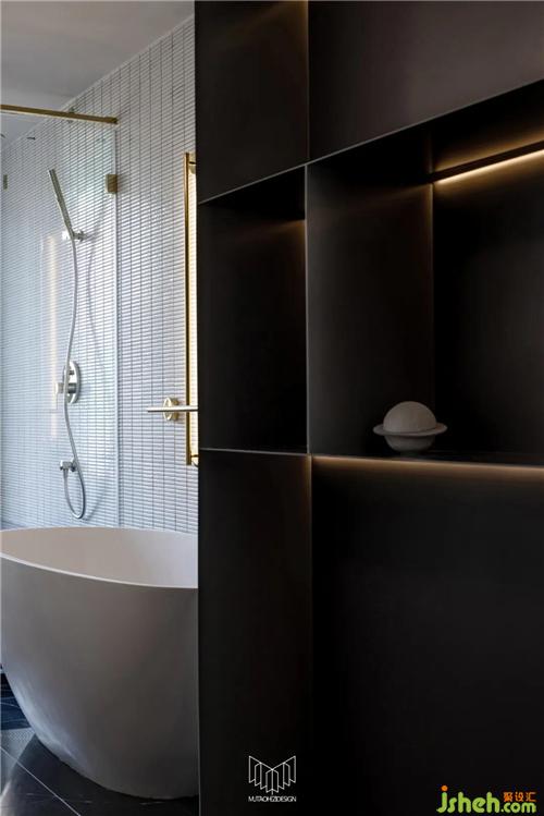 主衛(wèi)墻體拆除后,使用定制柜體和鋼板柜替代隔墻功能,衛(wèi)生間擴大后,功能更加多樣化,不僅滿足基礎盥洗功能,更配備了雙臺盆巖板一體盆和浴缸。定制柜體內(nèi)嵌燈光以襯托整體氛圍,色彩、材質也與主臥室融合呼應,極大了提高了生活品質,形成套房概念。