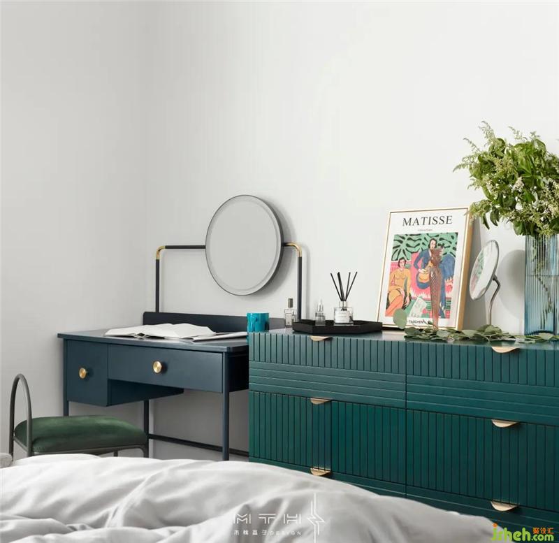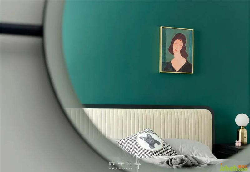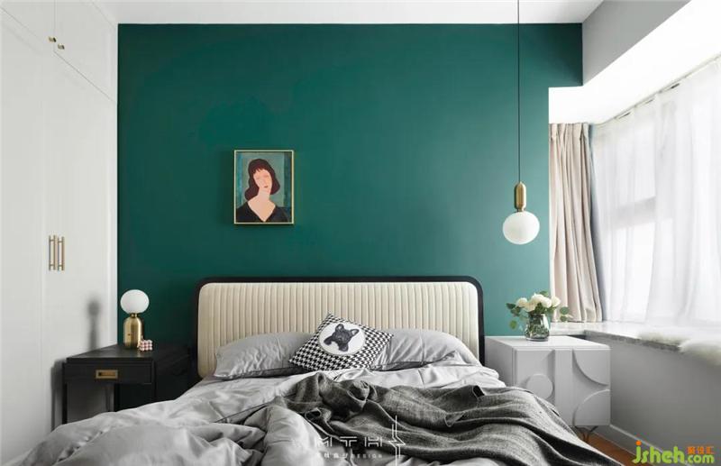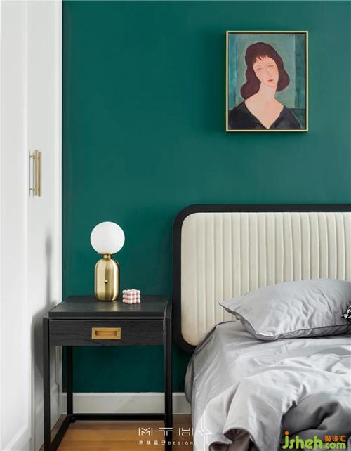 主臥室背景墻整面刷墨綠色乳膠漆,床頭選擇了一幅阿梅代奧·莫迪利亞尼的金色邊框人物肖像畫,畫的背景同樣也是藍(lán)綠色,南京裝修設(shè)計搭配在一起讓墻面更具層次感。床頭兩側(cè)臺燈和吊線燈組合布光,也增加了空間的裝飾效果。