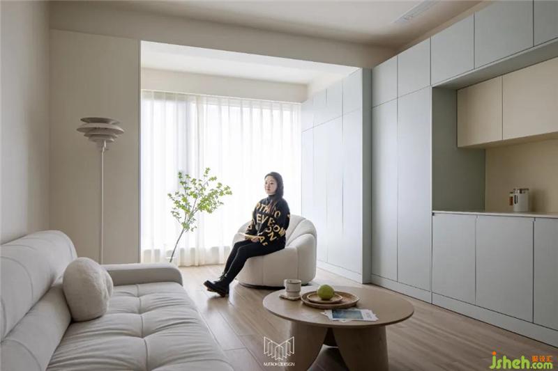 進門過道左右兩側(cè)布置大量鞋柜,完全可以滿足日常換鞋的需求,而且也可儲藏一些換季的鞋。進入門廳后,南京裝修設計在衛(wèi)生間門口布置實用性衣柜,可以便于日?;丶腋?,不用再放椅子上,顯得凌亂。