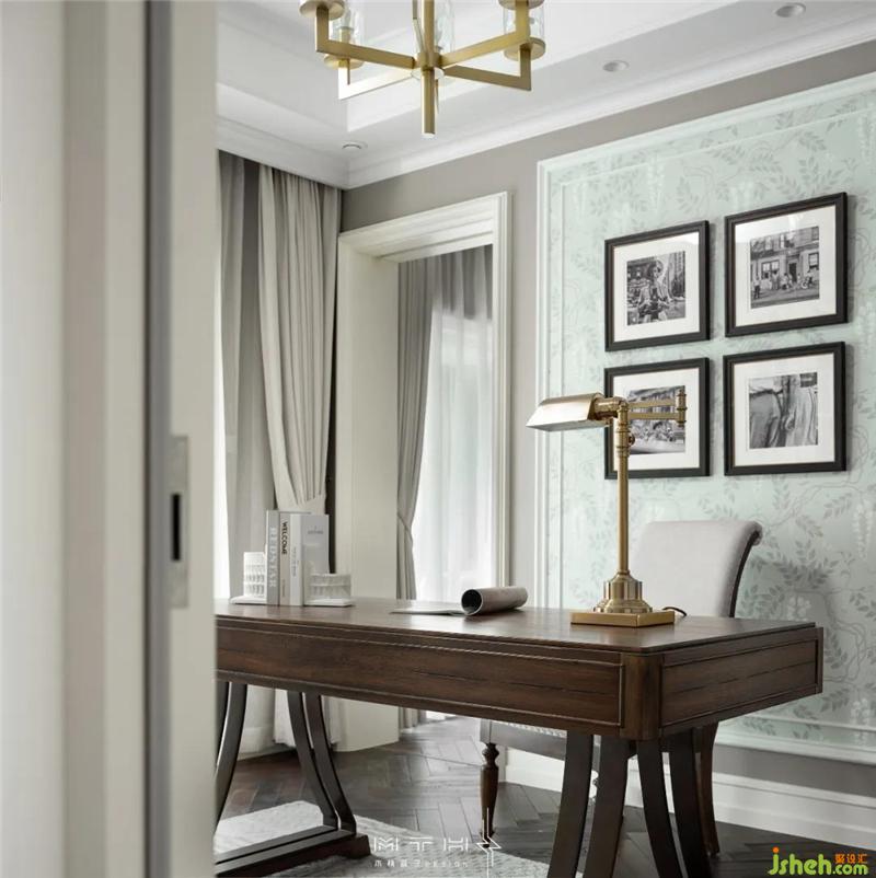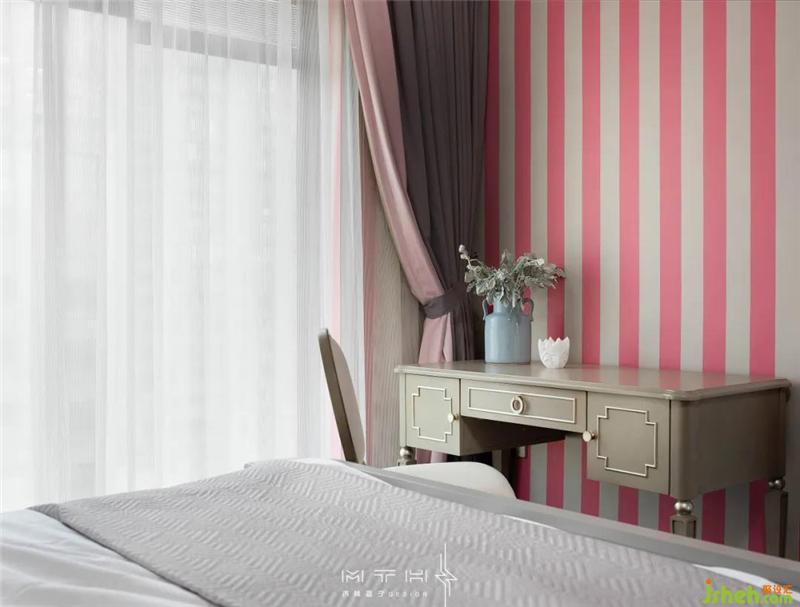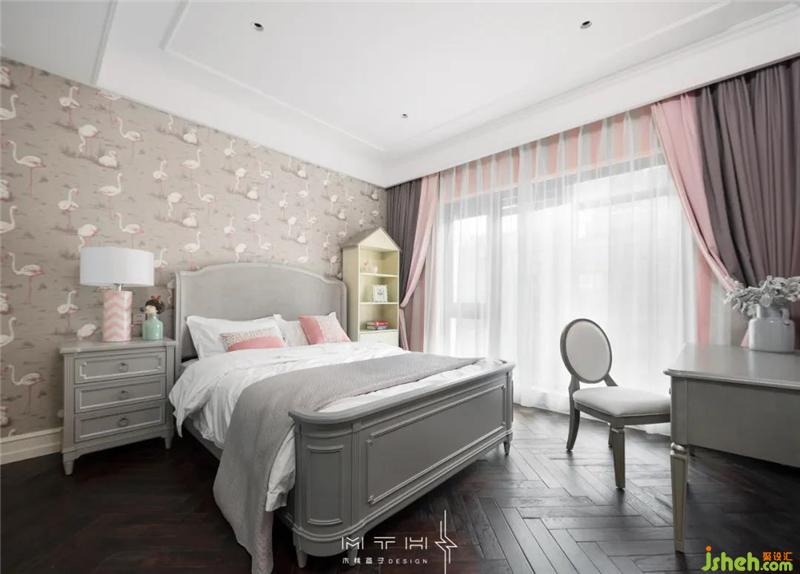 女兒房選用粉色作為環(huán)境色,暖灰色實木家具與白色床品搭配給人寧靜之感,南京裝修設計而床頭滿貼英國Cole&Son的Flamingos系列壁紙則增添了活潑的氣息。