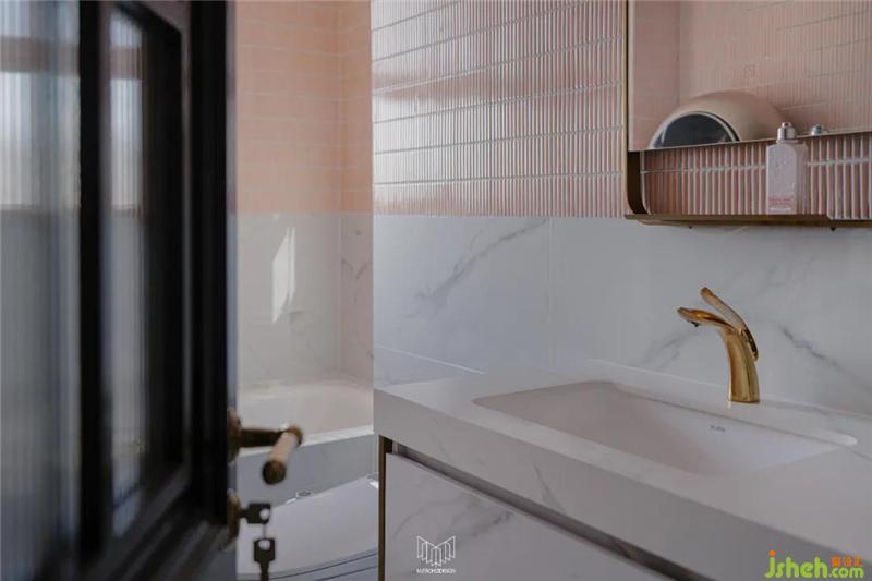過道臺(tái)盆區(qū)背后墻體定制柜體,左側(cè)柜內(nèi)可放置吸塵器等日常雜物,右側(cè)柜內(nèi)放置洗衣機(jī)、烘干機(jī)(上下組合)。