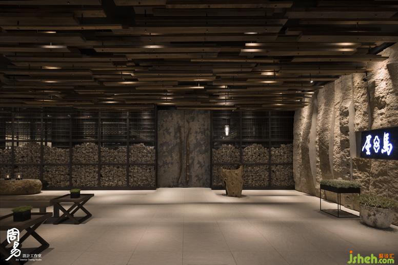 店前的開放區(qū)域,結(jié)合大量木條與背景燈光,形塑天花板不定向的漂浮格柵之美,設(shè)置多組舒適長 凳作為等候區(qū)。等候區(qū)的形象墻,以原石剖成條狀豪邁砌作,居中的「屋馬」店招宛如光點。店面 外觀融入橫幅水墨概念,以鐵件、鐵網(wǎng)加上內(nèi)側(cè)玻璃構(gòu)成半通透的介質(zhì),鐵網(wǎng)間置入稜角分明的灰 白咕咾石,堆成彷彿山巒起伏的稜線。
