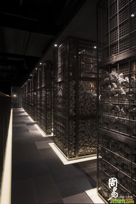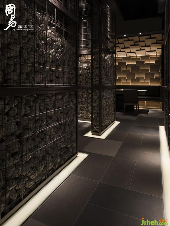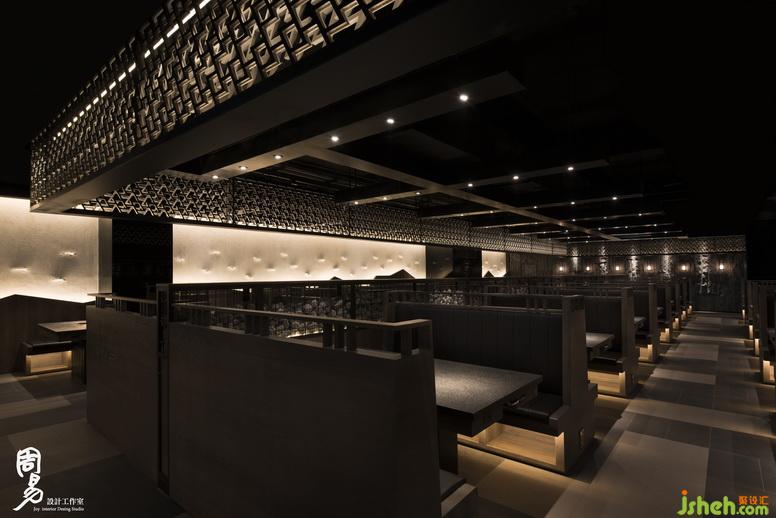 接下來,燈海水景兩邊依序安排客座列,兩翼上方刷黑的天頂,磅礡懸吊大尺度的矩形木構(gòu)造體, 造型擷取自中式窗欞的鏤空線條,在背景光襯托下,絕對是佐餐助興的最佳調(diào)劑!室內(nèi)設(shè)計師為了完成空間低調(diào)分界,在行列的卡座間,設(shè)置下襯燈光的鐵件短屏,鐵網(wǎng)界面間填入粒狀浮石,這種素材有著近 似硅藻土的特性,可以輔助調(diào)節(jié)室內(nèi)濕度,最內(nèi)側(cè)墻面以白水泥揉合稻草施作,墻間如悠游清波的 銀色魚群裝置,對話腰線下背光的山形木作飾版,與之閑情各表。包廂區(qū)延續(xù)相同金屬鐵網(wǎng)、浮石 介質(zhì),但改為至頂?shù)娜糸g模式,包廂內(nèi)部墻面采用大小不一的碎料檜木,進行多層次錯位堆棧。