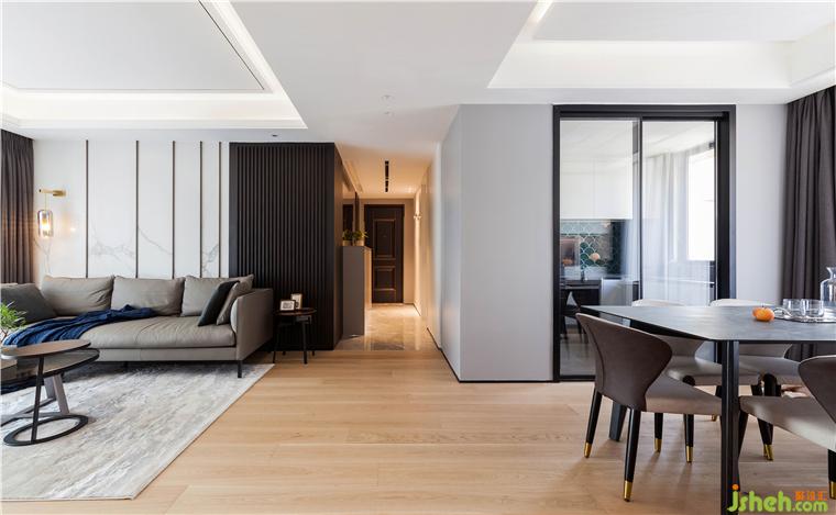 客廳空間氛圍上,希望回到家里有一種柔柔的遼闊包裹自己。把原餐廳位移出,作收納和過道部分融為一體,以大面積灰色為主,暖地面作為過渡層次,不至于太冷調,讓整個空間和色調簡約清新又不失溫馨。