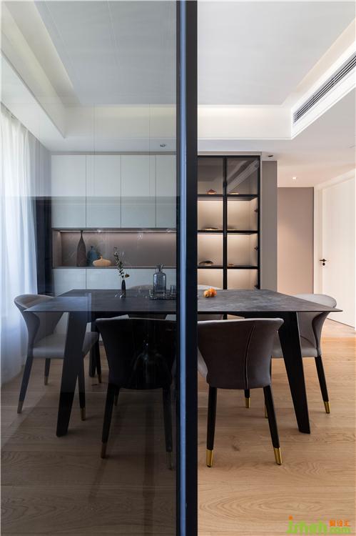 與入戶區(qū)連結在一起,以地面材質作為區(qū)分,互不干擾卻又相互陪伴,配合聚光射燈,夜晚時分在桌面投下幾個大大的暖黃光暈,用餐時光漫漫地溫柔了起來。