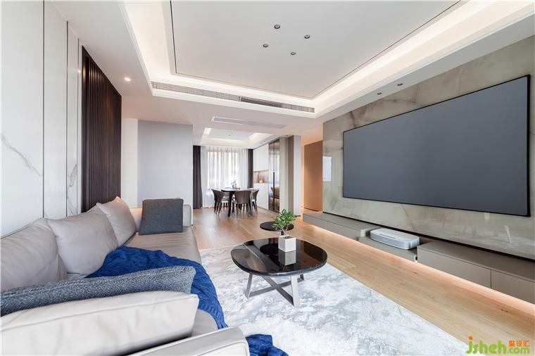 主 材: 灰色仿大理紋磚,藝術涂料,實木墻板,LED金屬條,原木地板