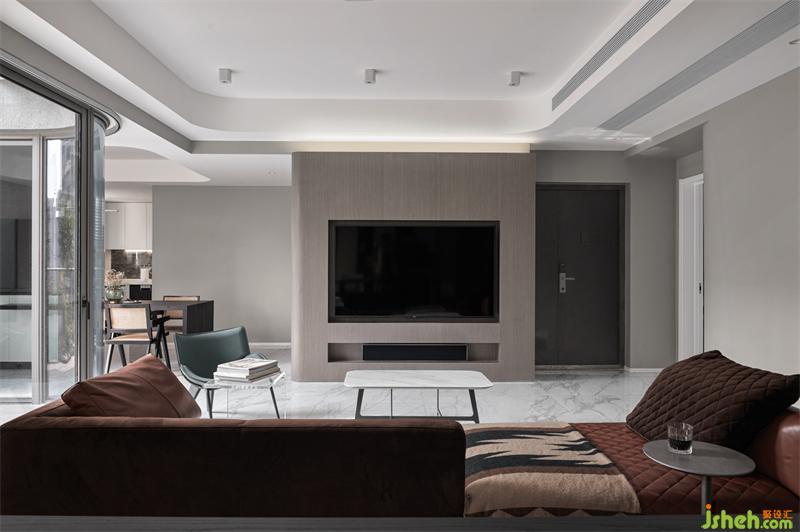 電視墻圓弧飾面,上方嵌入電視機,下方暗藏B&O回音壁