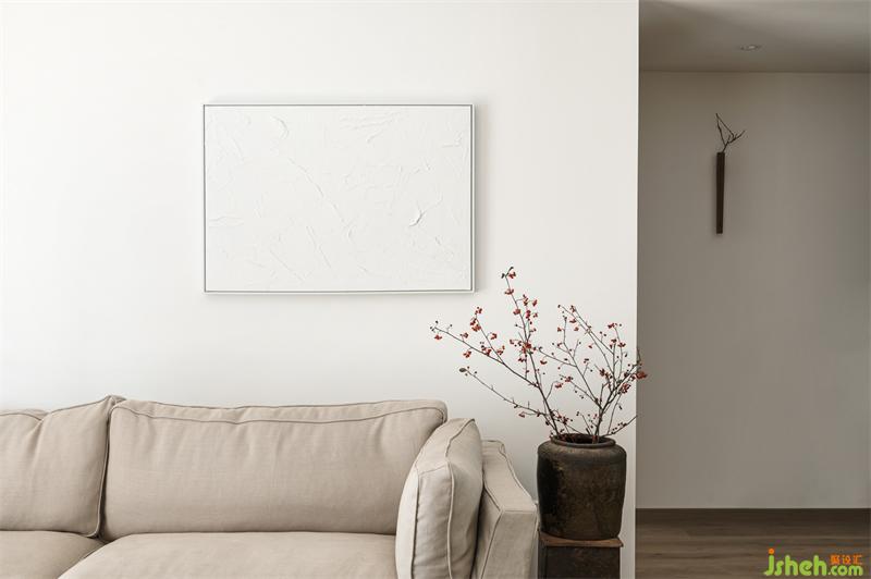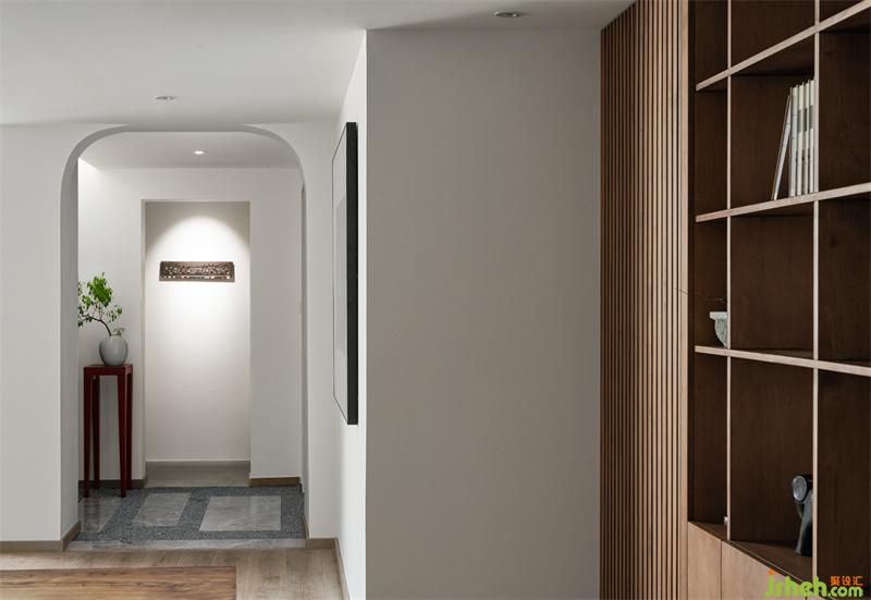 業(yè)主父母喜愛(ài)閱讀,我們?nèi)∠穗娨?,用書柜和書桌代替作為日常的休閑活動(dòng),書桌上置有茶臺(tái),喝茶看書或沙發(fā)區(qū)閑坐聊天,每個(gè)日常都充滿愜意。書柜選用原木色和不規(guī)則隔板設(shè)計(jì),沙發(fā)區(qū)背景使用留白的手法用冷靜的肌理石材調(diào)色,使得空間沉穩(wěn)。
