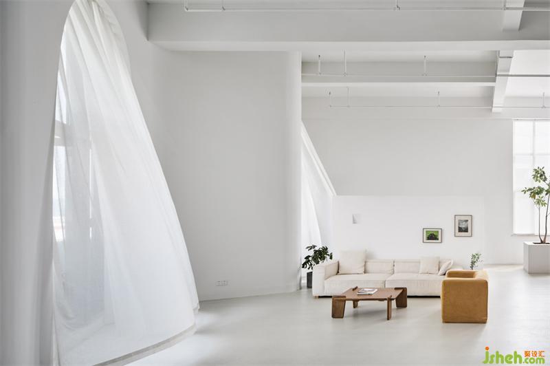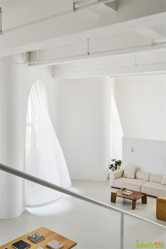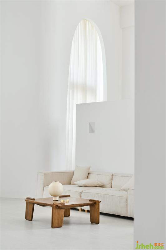 順從建筑的原生形態(tài),以新生的由于常規(guī)改造會(huì)面臨面積浪費(fèi)、造價(jià)高、工期長(zhǎng),同時(shí)還暗藏安全隱患等情況,設(shè)計(jì)師周子鑒決定采用順應(yīng)建筑設(shè)計(jì)的方法,用內(nèi)弧線柔化尖角,將高方窗改為高拱門,內(nèi)嵌電動(dòng)窗簾,在微風(fēng)與陽(yáng)光的互動(dòng)中,增加空間的靈動(dòng)感。姿態(tài)回應(yīng)人們對(duì)當(dāng)代空間的訴求。