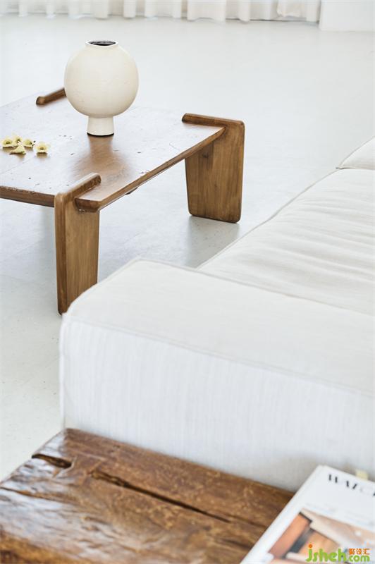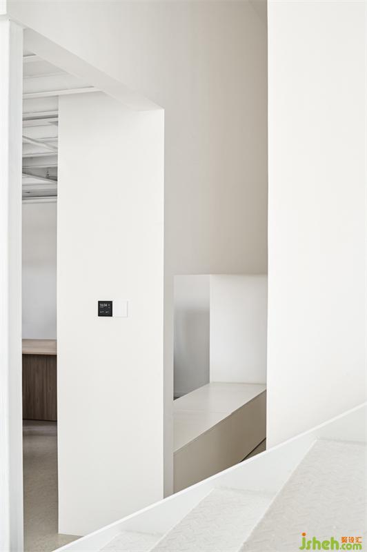 延續(xù)順應(yīng)的關(guān)鍵詞和設(shè)計(jì)師本身的喜好,空間選擇了大面積白的設(shè)計(jì)。白色涂料上墻,白色塊狀地膠做地,墻角處清水漆做一層耐擦洗的罩面處理,實(shí)現(xiàn)無(wú)踢腳設(shè)計(jì);干凈純白的空間借助幾何線條打破空間的沉靜,使用適量的原木線條和木質(zhì)家具增加溫潤(rùn)質(zhì)感。