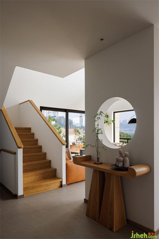 本案為重慶江岸別墅,坐擁極佳視野;重慶江岸別墅裝飾為更加貼合業(yè)主【外在樸素自然,內(nèi)心豐富淡然】的生活態(tài)度,設(shè)計(jì)師周子鑒利用大面積開(kāi)窗引入自然景觀,以簡(jiǎn)單留白營(yíng)造自然氛圍;于室內(nèi),設(shè)計(jì)考慮動(dòng)線的便利以及居者的舒適性感受,通過(guò)挑空、圓洞、弧形、框景等設(shè)計(jì)手法勾勒出“園林中一步一景”的清雋淡雅,淺橡木與白色的貫穿搭配,讓久居城市的人感受深度的園林賞玩感:入眼的山水,花園,隨處可見(jiàn)的綠植,方圓之中,結(jié)為一體,又各具風(fēng)韻。