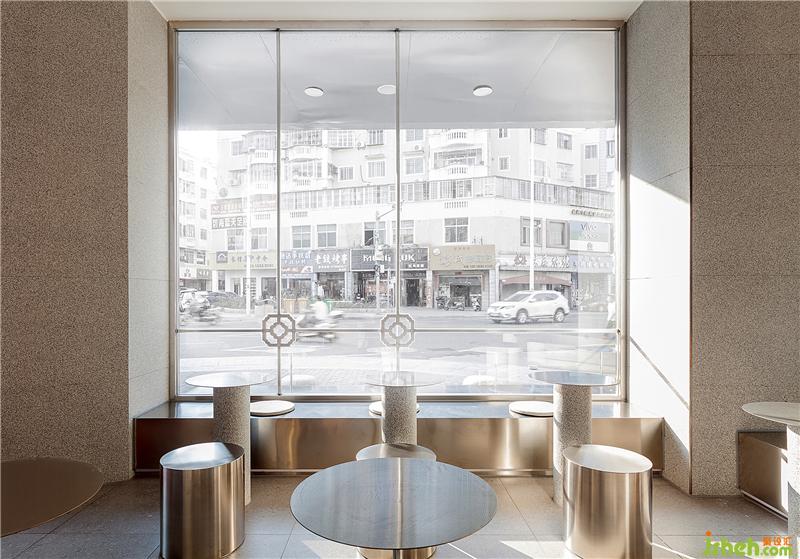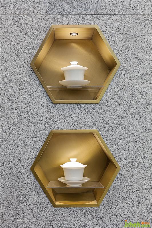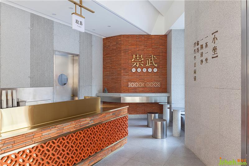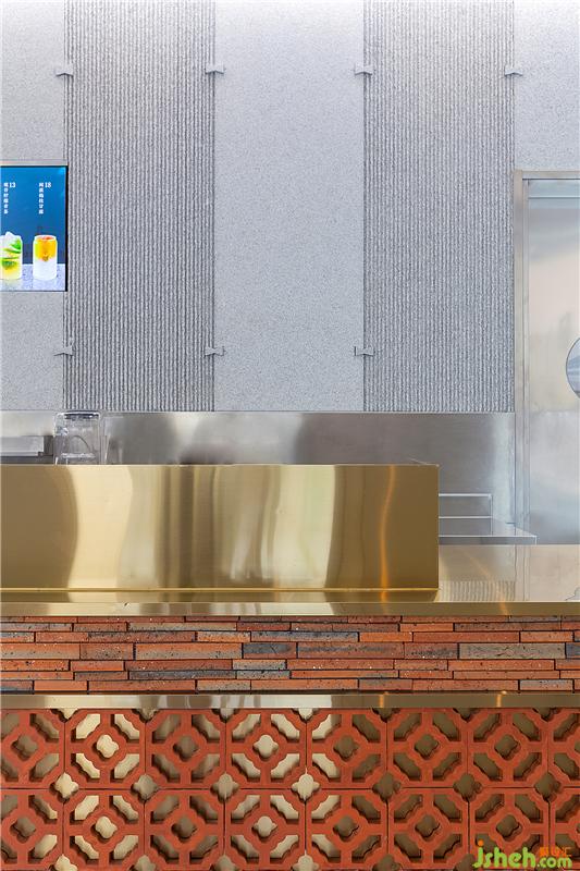 傳統(tǒng)的閩南花格與現(xiàn)代灰冷的鋼板相互碰撞,精致復(fù)古的黃銅元素點綴,以及花崗巖背景墻板間的卯榫石扣件等等,都在深度挖掘一種閩南傳統(tǒng)建筑元素與年輕化的設(shè)計語言相結(jié)合的新式閩南茶飲空間。