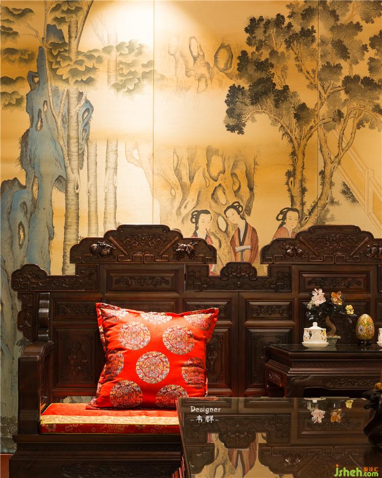 把男女主人公的愛好融入裝飾中,通過(guò)手繪墻壁紙、木飾面、大理石和花格等中式元素來(lái)表現(xiàn)傳統(tǒng)中式風(fēng)格,利用是軟裝等個(gè)性化飾品增加專屬性。