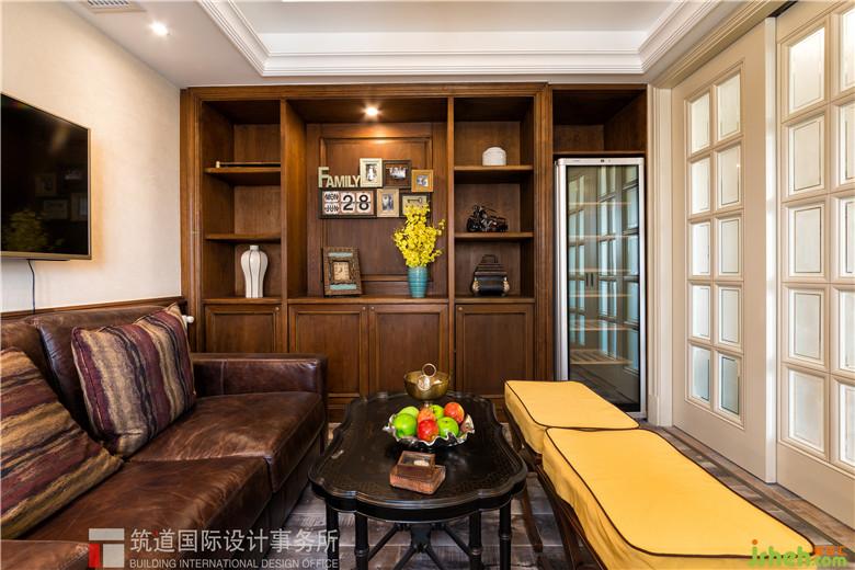 空間色調(diào)以大地色為基礎(chǔ),營(yíng)造了家的溫馨的基調(diào)。軟裝以深淺藍(lán)色幾何圖案沙發(fā)和地毯搭配明黃色抱枕,再佐以經(jīng)典美式風(fēng)格的咖色真皮沙發(fā)及做舊實(shí)木家具,顏色對(duì)比明亮活躍,讓整體空間充滿美式風(fēng)格又不失活力。