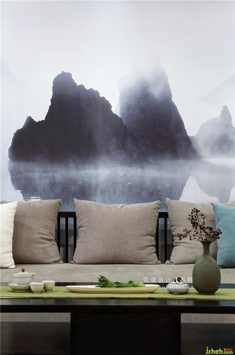 中式風(fēng)格講究的是對稱。簡約自然的木飾面搭配中國風(fēng)情的山水畫墻布,穩(wěn)重、高雅的基調(diào)一下子奠定了整個空間。