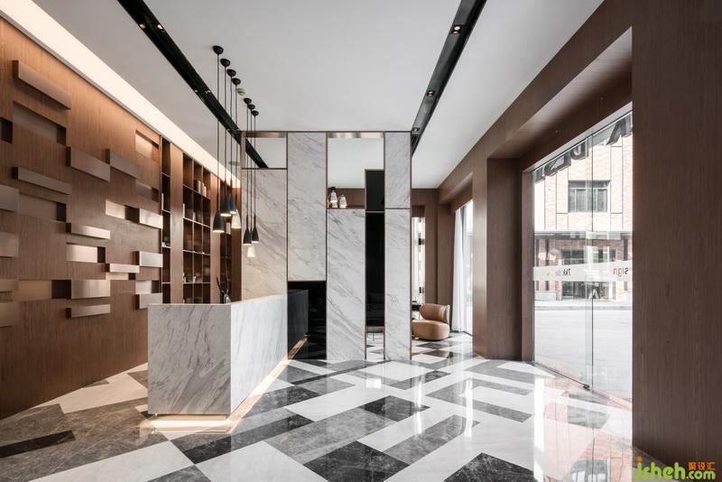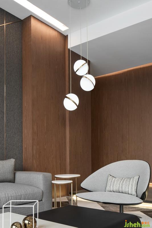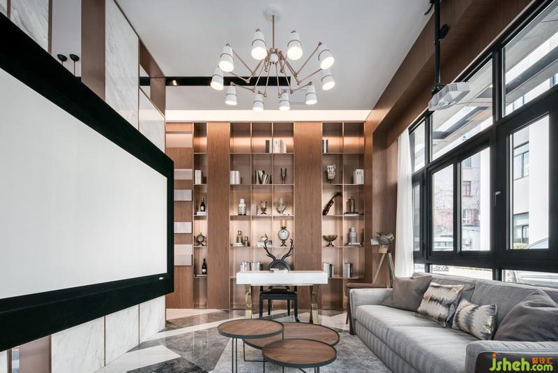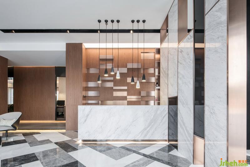 室內(nèi)設計師把辦公室以展廳的形式展示出來,進門是客廳是比較大氣的空間,大理石紋理的地面搭配硬包材質(zhì)的沙發(fā)背景墻,灰色質(zhì)感的沙發(fā),簡單藝術造型的茶幾,前臺的設計比較個性化,簡約的條線垂掛下來的吊燈,背景墻凹凸的造型在演示著不一樣的韻律。黑色玻璃鏡面搭配大理石,用金屬材質(zhì)收邊作為客廳和影音室的隔斷,通透美觀時尚。