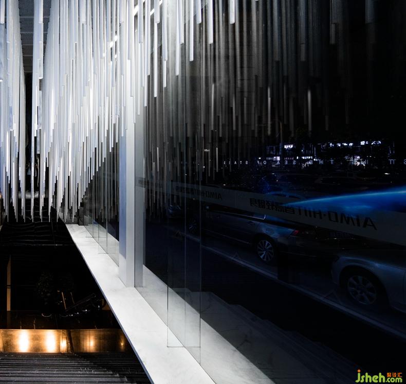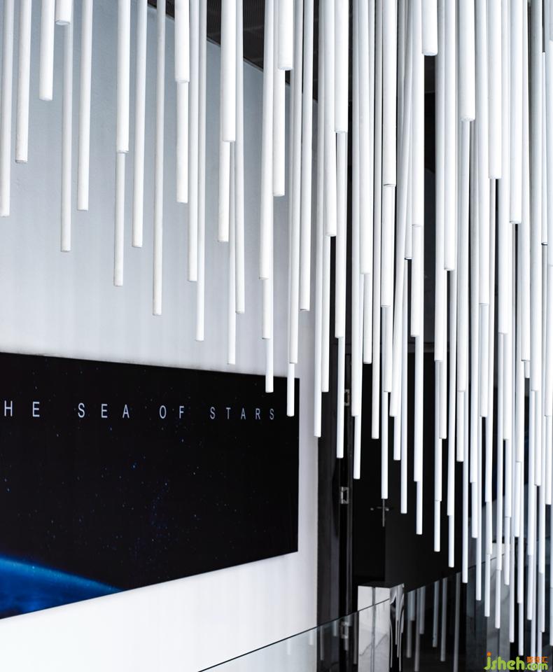 ▼體驗中心的入口樓梯局部,白色條狀裝飾物從天花板上垂下來,partial view of the entrance stairs of the Health Management Center