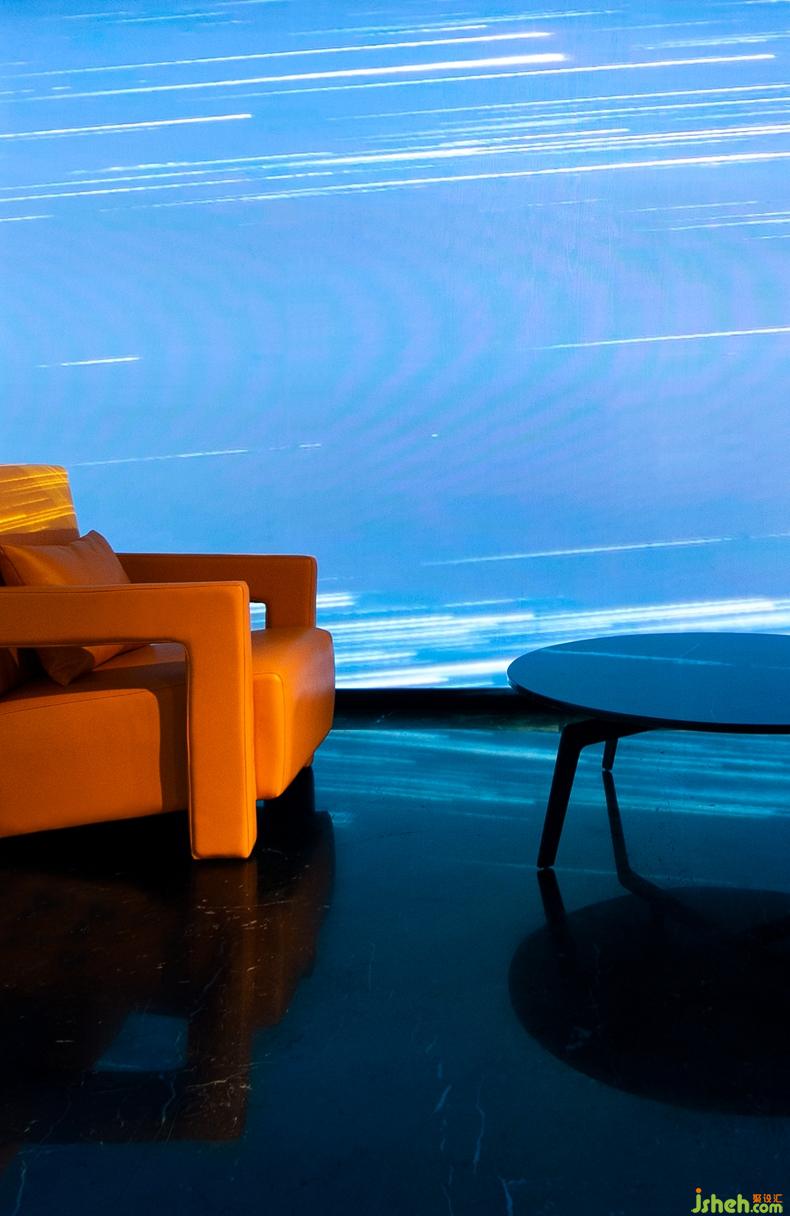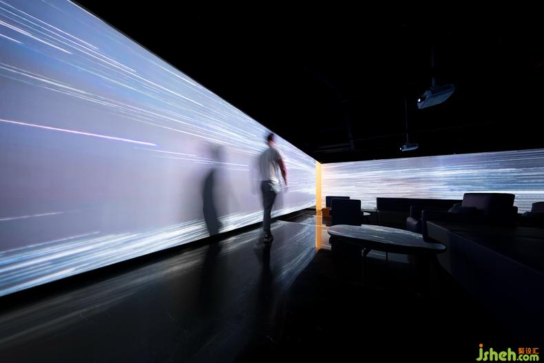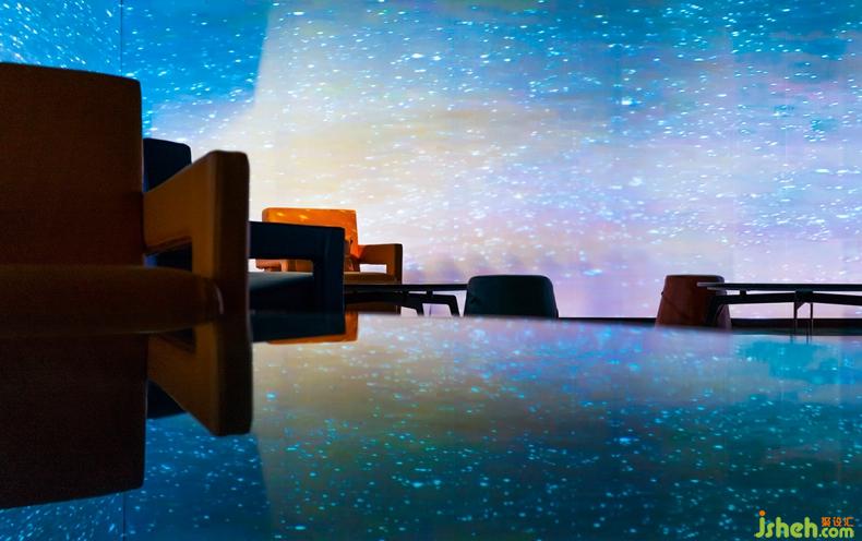 對設計師來說,設計材料不僅局限于飾面板等物理材料,更要善于運用新的概念化的材料。在本案中,設計師營造的是一個浸沒式的現(xiàn)場,利用玻璃的透明和反射原理,通過全息投影融合軟件使得投影畫面更加完整,尺寸更大,層次感更強,讓顧客在其中全方位地感受全景影像畫面所帶來強大的視覺沖擊感。深圳設計公司