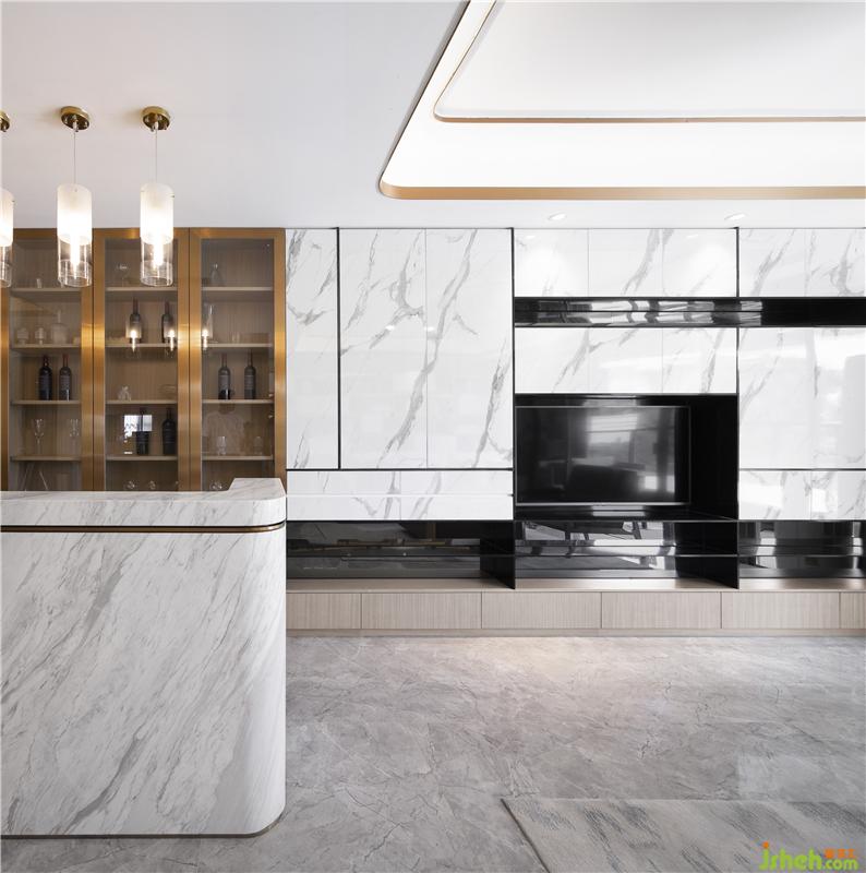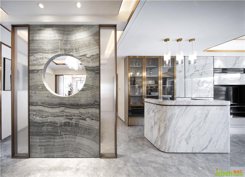 步入玄關,開闔縱橫的空間格局、經(jīng)典與現(xiàn)代的碰撞,體現(xiàn)了空間包容與開放的美學態(tài)度。鏤空圓框隔而不斷,多重材質拼接打破逼仄與沉悶,營造出通透敞亮的整體氛圍。一旁的酒柜和吧臺,于干凈利落的空間格局中融入石材與金屬, 創(chuàng)造出獨有的質感和藝術肌理,讓奔波了一天的疲憊身心瞬間放松下來。裝修公司