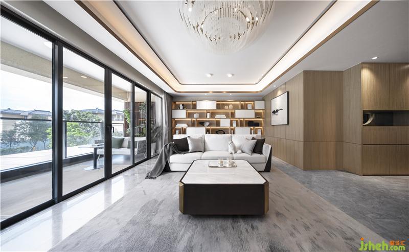 寶石藍灰混搭色羊毛編織地毯上擺放著愜意而有品質感的沙發(fā),一旁襯以優(yōu)雅的邊幾燈飾,滿足生活功用與審美,彰顯精致品味。沙發(fā)后的博古架綴以精巧的擺件,與圓型山水掛畫交相輝映。天花流瀉而下的藝術吊燈,彰顯出純粹的現(xiàn)代質感,線條舒展中也印刻出對細節(jié)的極致追求。裝修公司