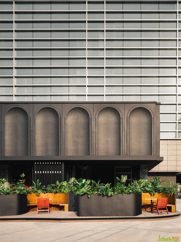 主要材料:GRC、成品木飾面板、古銅不銹鋼、防腐木板、無(wú)機(jī)水磨石、手工磚等