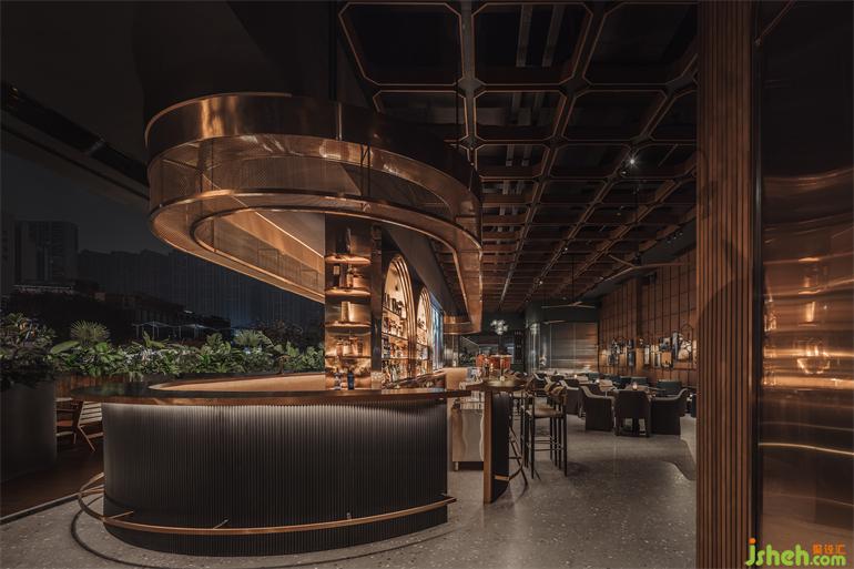 吧臺(tái)用了釉質(zhì)實(shí)木桌面和銅制金屬酒柜,這兩種材質(zhì)的結(jié)合讓調(diào)酒區(qū)兼具實(shí)用和美感,顯得復(fù)古而摩登。酒吧設(shè)計(jì)回形的長(zhǎng)桌既使室內(nèi)向室外的延伸,又讓人流動(dòng)線產(chǎn)生更多的交互,美酒讓拱形酒架猶如璀璨的藝術(shù)品,它兼顧了實(shí)用與美觀,方便讓調(diào)酒師們更好地掌控全局。
