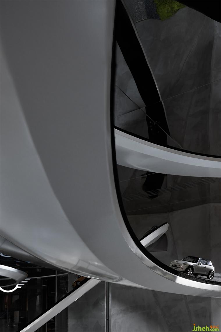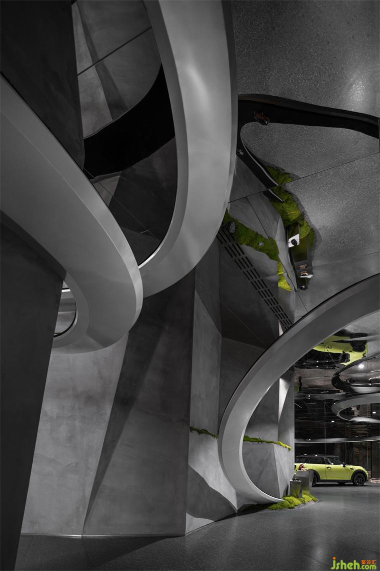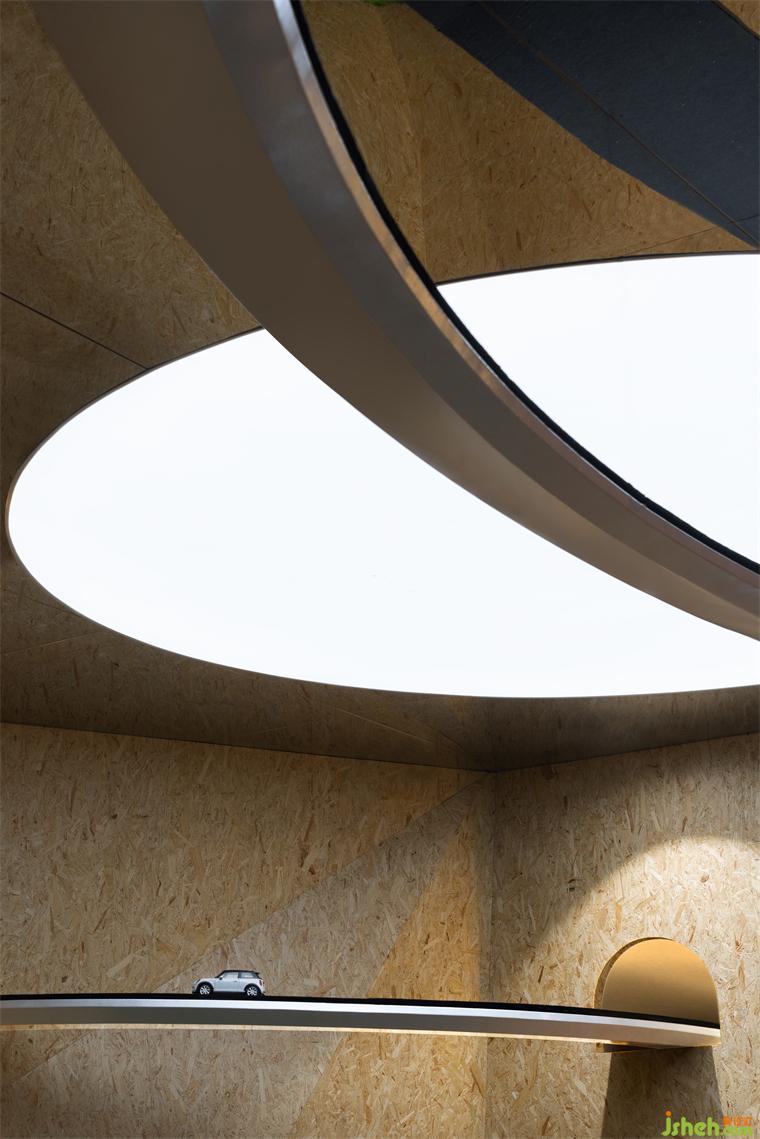 穿插旋繞在各處的跑道賦予空間極具張力的動勢屬性,是品牌內(nèi)核理念飛馳的有形載體,展廳設(shè)計(jì)外化MINI“自由自在”的精神性追求,但看似隨意穿行的跑道實(shí)則精心構(gòu)造。