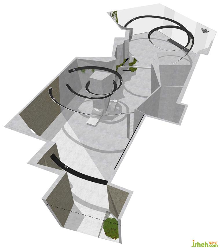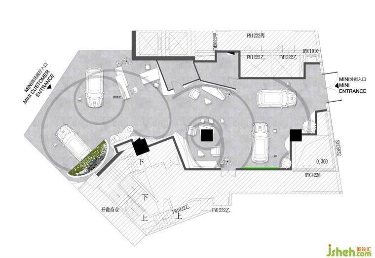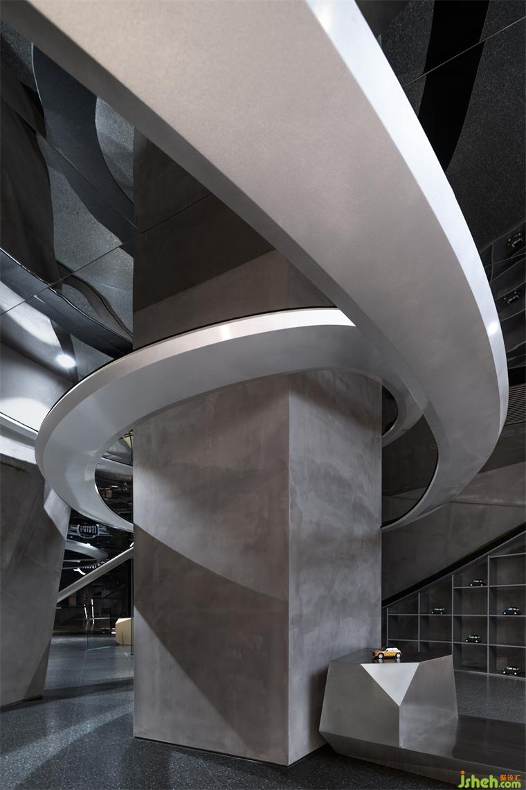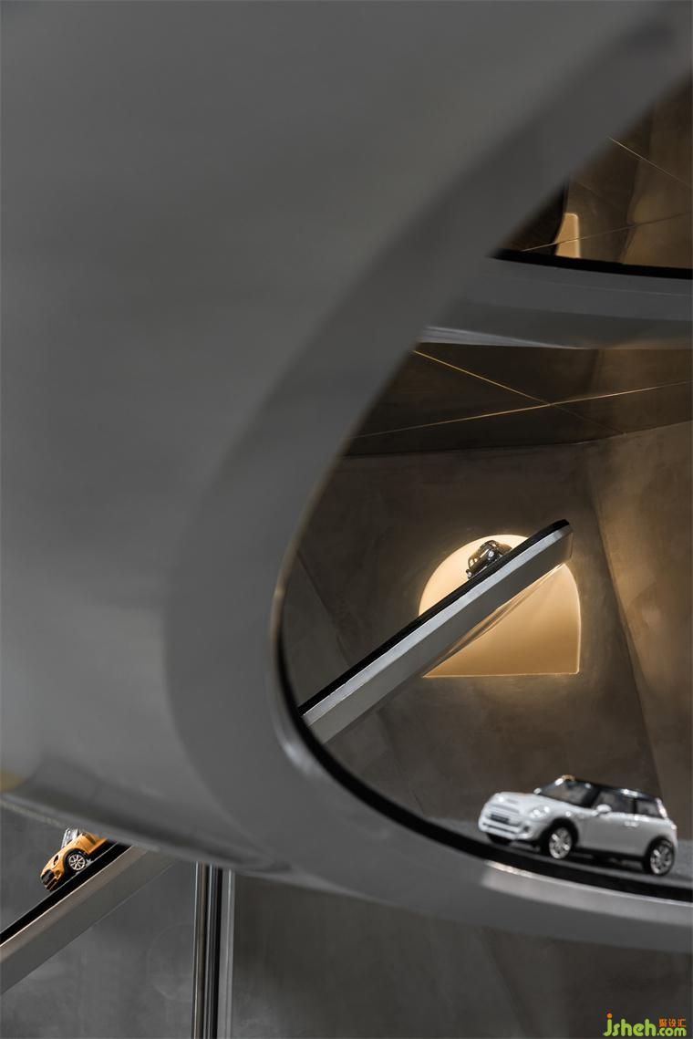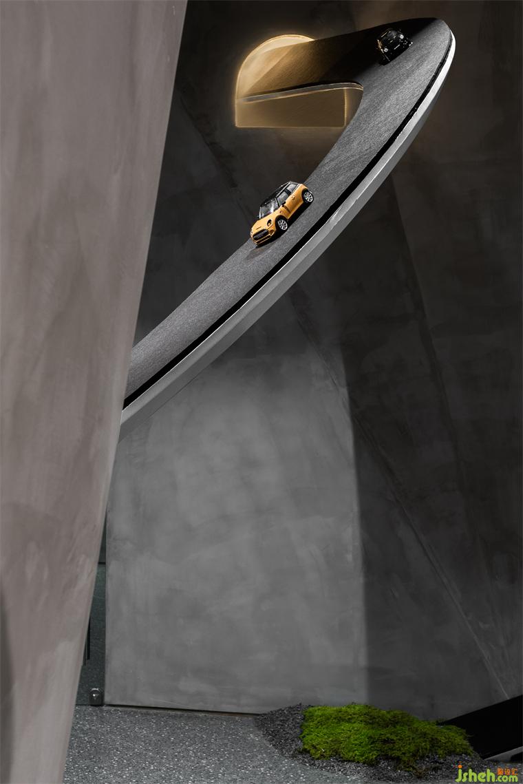 考慮到“MINI車”的巨大單體量,展廳的動線需要保證汽車在其中能夠靈活挪動,展廳設(shè)計(jì)所以跑道的高度和走向設(shè)計(jì)具有一定的限制性,并且跑道所帶來的視覺效果也要納入考量。