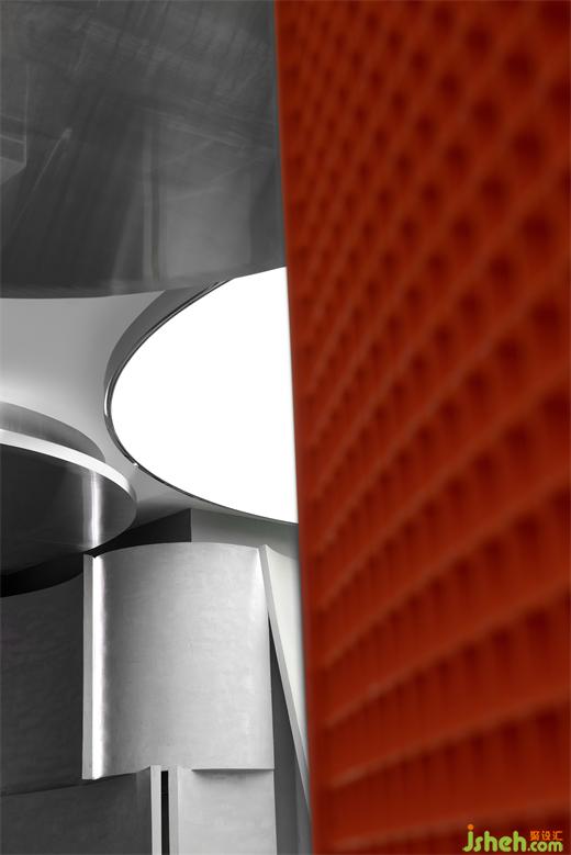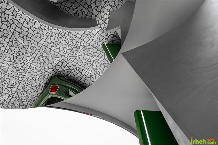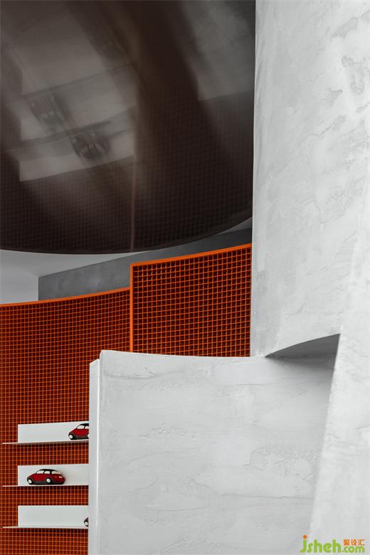 寶馬MINI的強(qiáng)大精神力來源于從不同客戶的人生經(jīng)歷中汲取內(nèi)驅(qū)力量,展廳作為品牌精神的具象表達(dá),更須凸顯MINI集眾所愛、自成風(fēng)尚的個性特質(zhì)。為此,設(shè)計師選擇多元材質(zhì):微水泥質(zhì)感墻面、客戶體驗中心設(shè)計圓形鏡面不銹鋼局部吊頂、橙色不銹鋼置物架、水磨石地面預(yù)制板……不同材質(zhì)的糅合渲染出戲劇性的碰撞與反差,形成意象與現(xiàn)實的重疊、對立,將空間向度引向未來,筑成一域映照現(xiàn)實又鏈接未來的馭美空間。